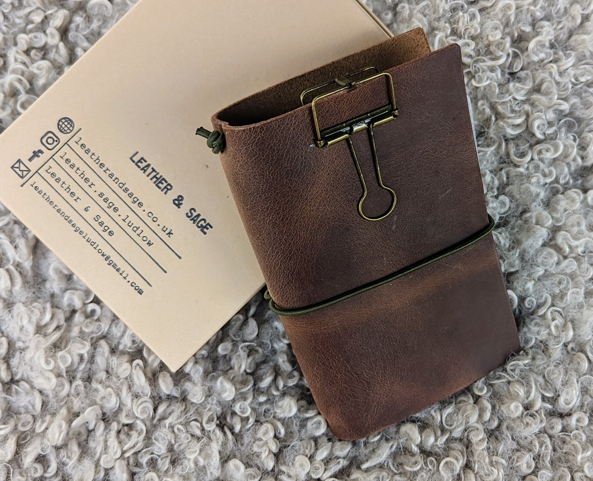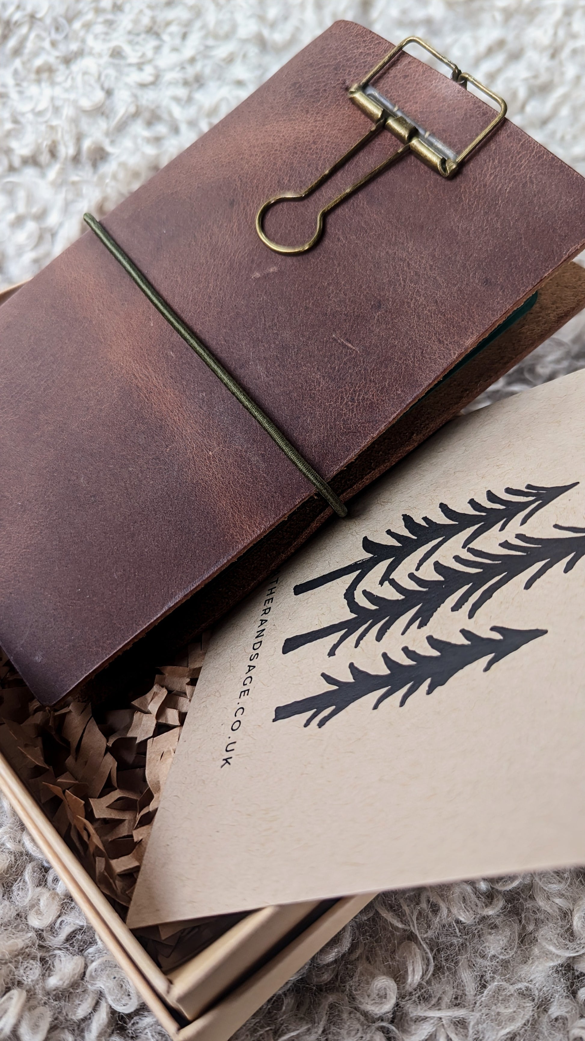 The Mini Ouroboros includes three slate blue, refillable, hand-bound, bullet and plain notebooks; two waxed linen and leather bookmarks; a brass bulldog clip with jotter pad; gold paper clips and a plastic wallet to keep your maps (or poems) dry. The bookmarks are made from rescued leather and we'll choose complementary colours to your cover.